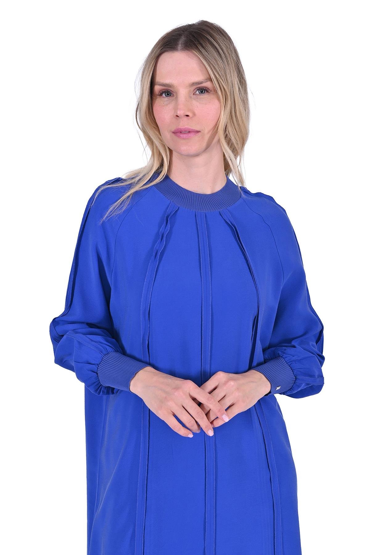 İnce piliseli A kesim siluetiyle zarifçe dökülen bu hafif elbise; bisiklet yakası, balon kollar ve ribana manşetlerle modern bir dokunuş sunar. Ofisten davete, gündüzden geceye rahatlıkla taşıyabileceğiniz konforlu ve şık bir tercih.
