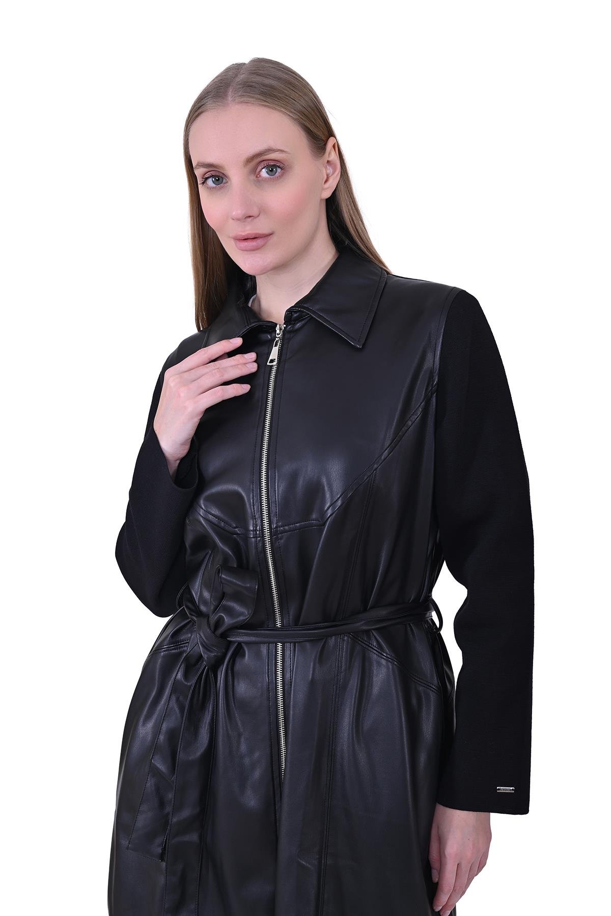Günlük şıklığınızı tamamlayan fermuarlı ön kapama ve bel kemeriyle vücut hatlarınızı zarifçe vurgular. Kontrast kollu tasarımı, modern çizgilerle klasik duruşu birleştirerek her kombinize karakter katar.