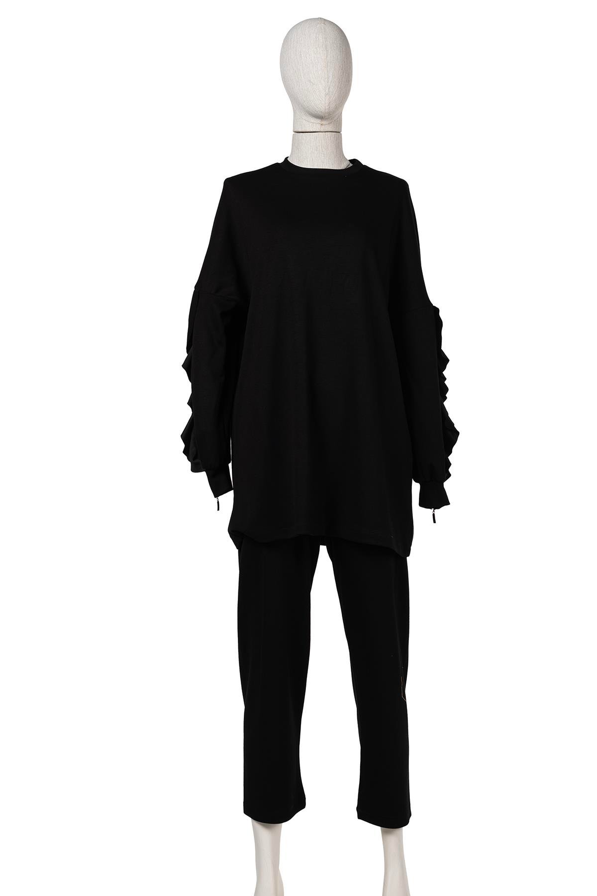 Günlük şıklığı ve konforu bir arada sunan bu takım, rahat kesimli tunik ile uyumlu pantolondan oluşur. Tuniğin kol detayı, zarif fırfır tasarımıyla sade kombinlere hareket katarken, pantolonun rahat kesimi tüm gün boyunca konfor sağlar.