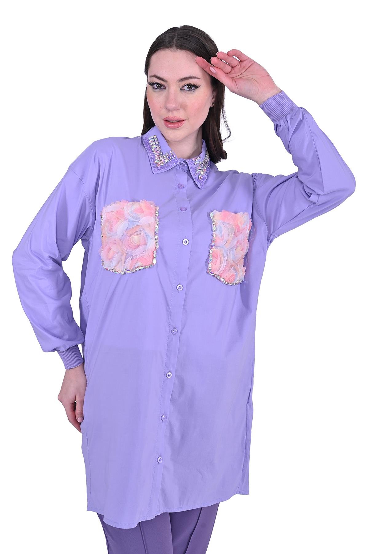Taşlı yaka ve volanlı çiçek cepleriyle zarafet sunar. İnce, nefes alır kumaşıyla sıcak günlerde bile ferahlık sağlar. Salaş kesimi, hareket özgürlüğü tanırken şıklığınızı korur. Jean veya kumaş pantolonlarla kombinleyerek hem rahat hem de şık görünebilirsiniz.