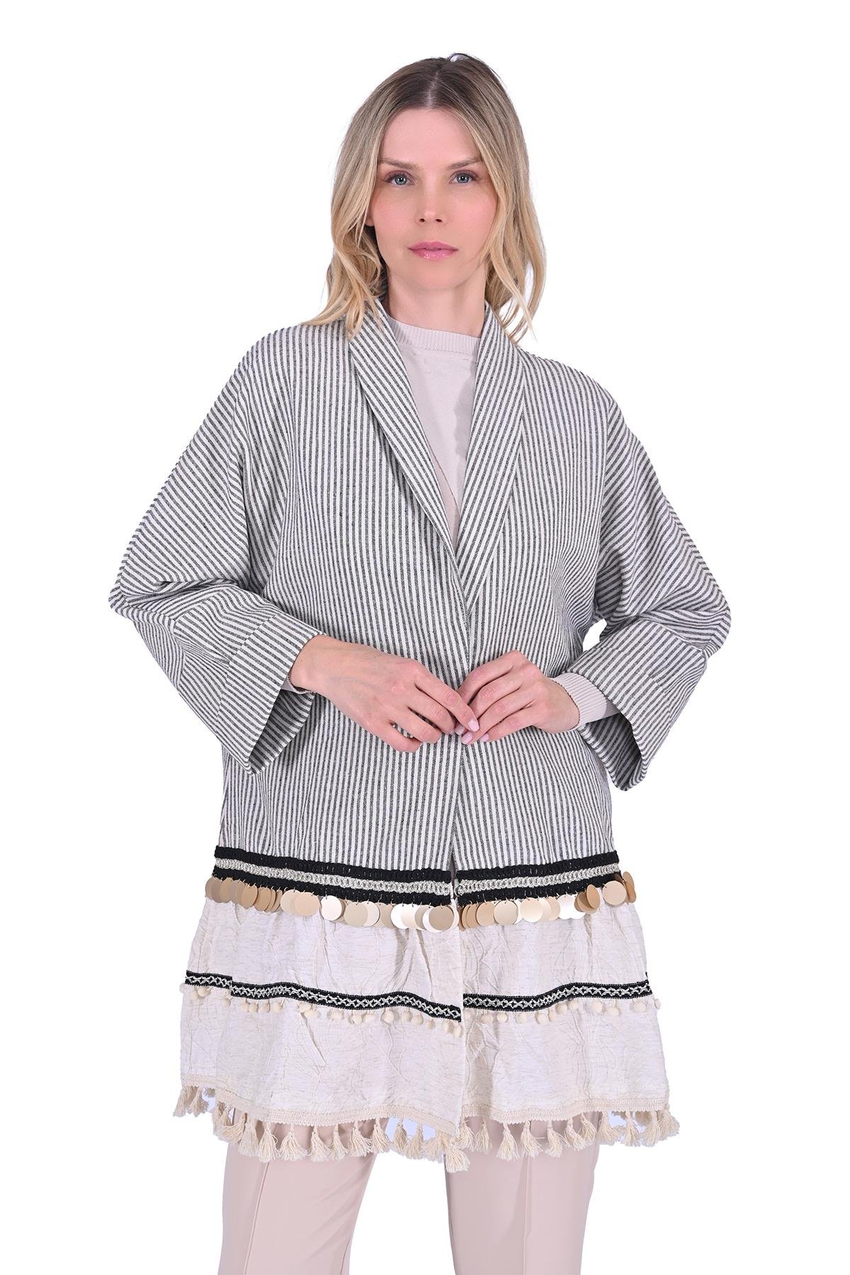 Salaş kesimli ceket, ince çizgili dokusuyla modern bir bohem hava sunar. Etek ucundaki püskül ve metal disk detayları, hareket halinde göz alıcı bir ritim yakalar. Hafif yapısı, katmanlı kombinlere zarif bir tamamlayıcı olur.