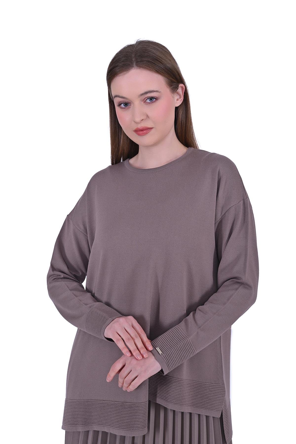 Trikodan üretilen bu tunik, zarif işlemeleriyle farklı bir şıklık sunar. Hafif dökümlü kesimi, rahat kalıp pantolonla uyumlu bir takım oluştururken gün boyu konfor sağlar. İnce detaylı nakışlar, sade siluete sofistike bir hava katar.