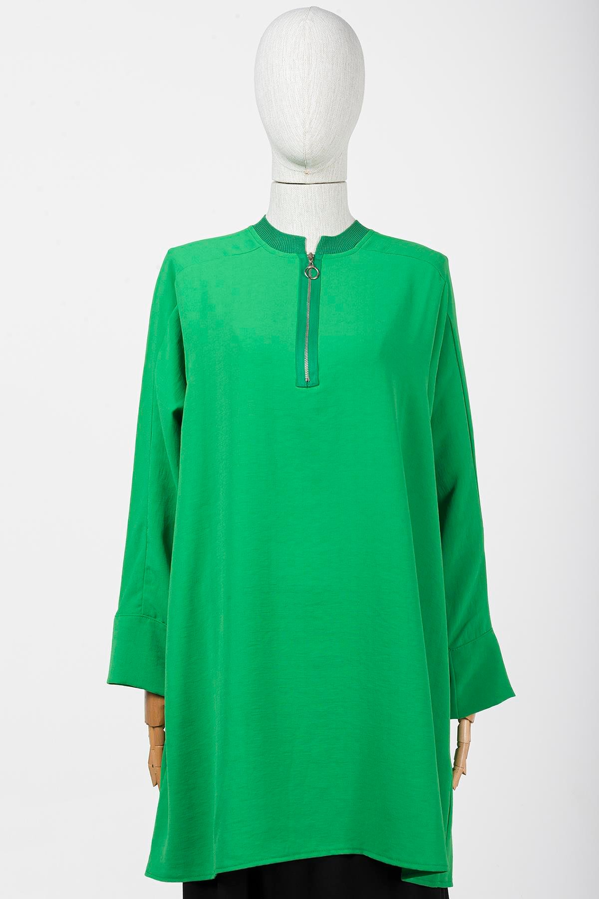 Önden fermuarlı oversize tunik, şık bir duruş sunan modern çizgileriyle öne çıkıyor. Salaş kesimi hareket özgürlüğü sağlarken, uzun kol detayı konforu garanti ediyor. Zengin dokusu, günlük stilinize yalın bir zarafet katıyor.