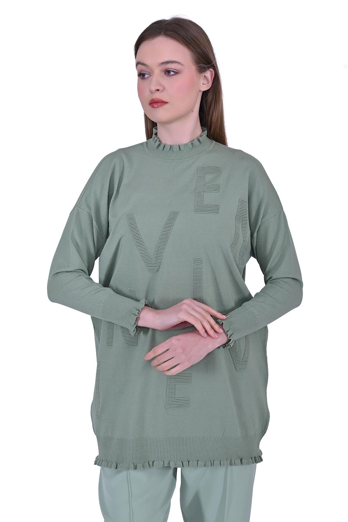 Yumuşak dokulu triko tunik, sade şıklığı sevenler için ideal bir parça. Gövdedeki kabartma yazı detayları modern bir hava katarken, fırfır yaka ve etek ucu tasarımıyla zarif bir görünüm sunar. Şıklığı sadelikle buluşturan zarif bir tunik!
