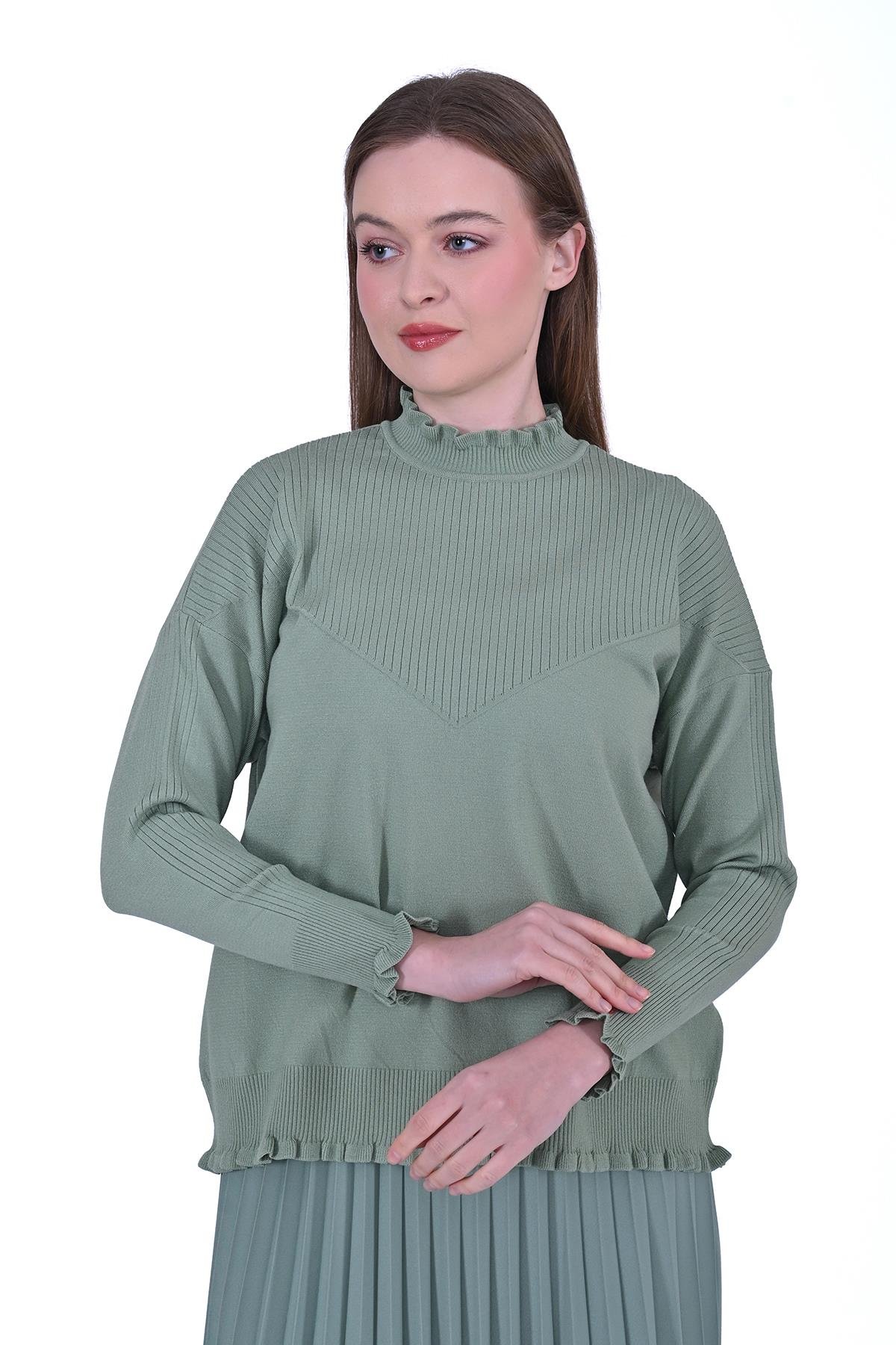 Bu triko kazak, yumuşak dokusu ve fırfır detaylarıyla zarif ve konforlu bir stil sunar. Günlük ve ofis kullanımı için idealdir; etek veya pantolonlarla rahatça kombinlenir.