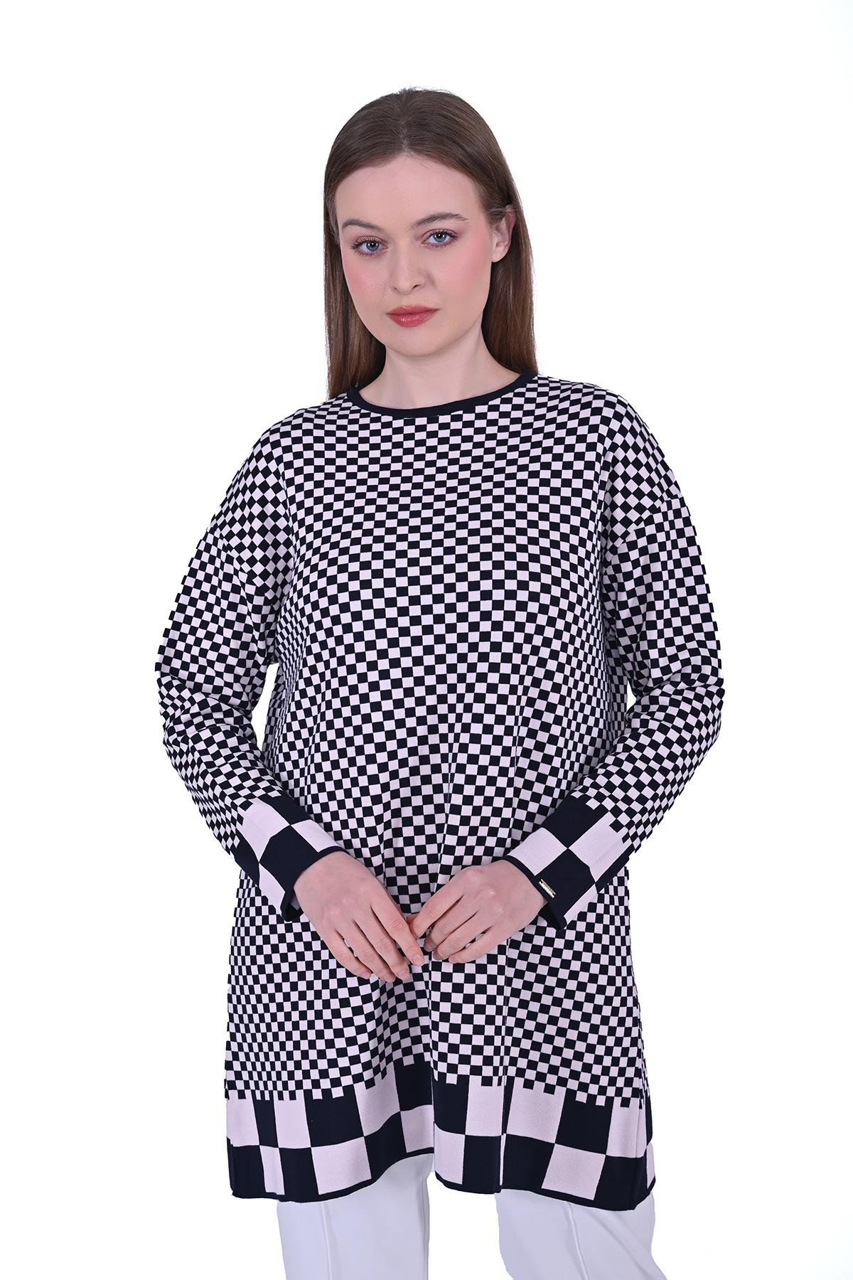 Modern çizgileriyle dikkat çeken bu triko tunik, ön yüzeyindeki geometrik desenleri ve kollarındaki ribana detaylarıyla özgün bir stil sunar. Rahat kesimi ve yumuşak dokusuyla günlük şıklığınızı konforla tamamlar. Yan yırtmaç detayları hareket özgürlüğü sağlarken, minimal tasarımıyla zamansız bir parça olarak gardırobunuzda yerini alır.