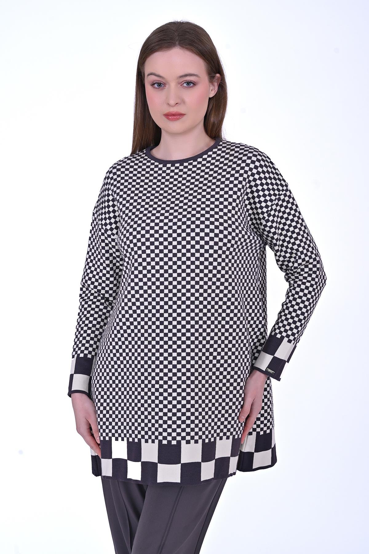 Modern çizgileriyle dikkat çeken bu triko tunik, ön yüzeyindeki geometrik desenleri ve kollarındaki ribana detaylarıyla özgün bir stil sunar. Rahat kesimi ve yumuşak dokusuyla günlük şıklığınızı konforla tamamlar. Yan yırtmaç detayları hareket özgürlüğü sağlarken, minimal tasarımıyla zamansız bir parça olarak gardırobunuzda yerini alır.