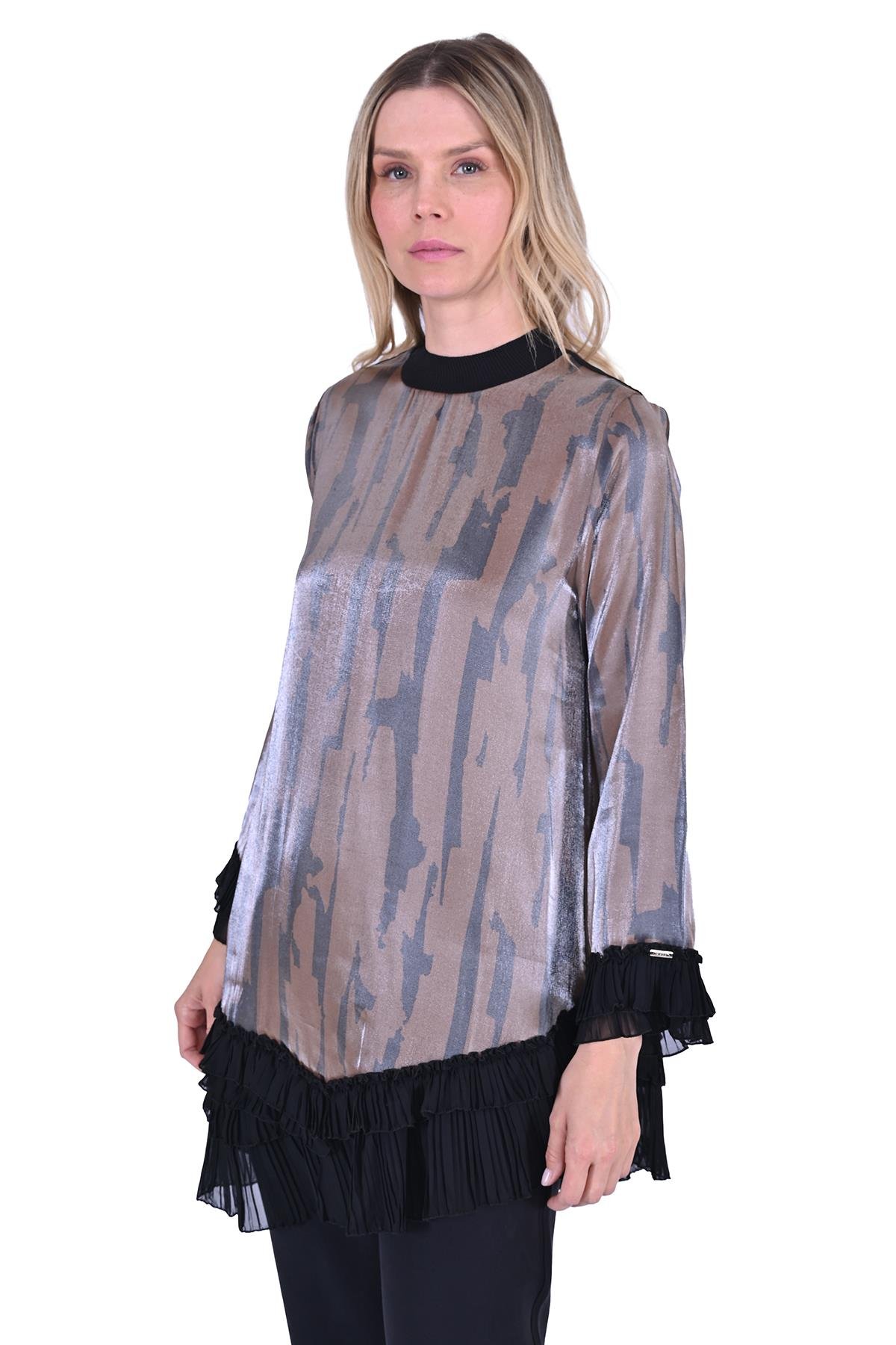 Silk görünümlü dokusuyla zarif bir duruş yaratan tunik; geniş kalıbı ve uzun kol yapısıyla konforu ön planda tutar. Asimetrik kesim alt kısmı ve kol ve etek ucu plise detayları, hareket katarken modern bir hava kazandırır.